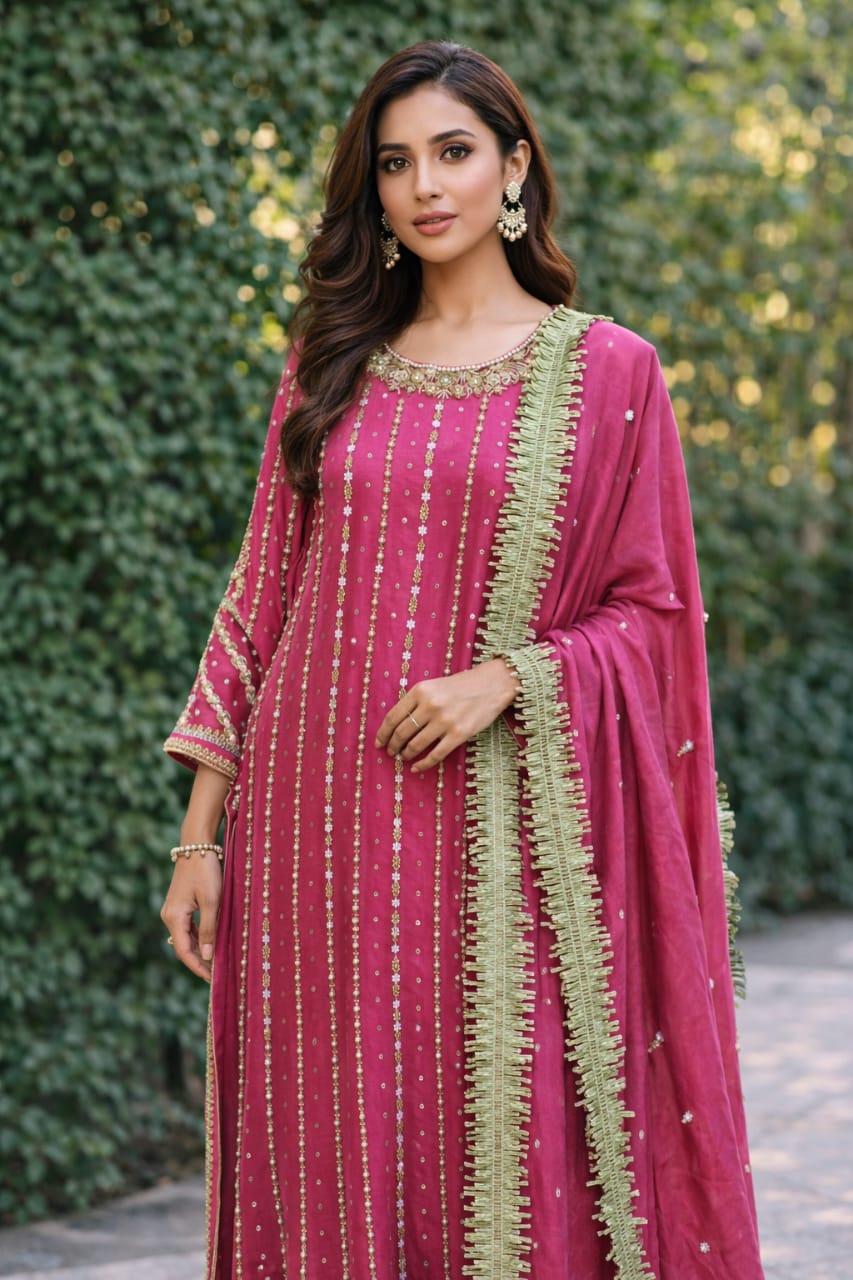 This elegant party wear outfit is beautifully crafted with fine dabka handwork, giving it a luxurious and timeless appeal. Every detail is designed with precision and care to ensure you stand out gracefully at any special occasion. The intricate embellishments enhance its sophisticated charm, making it a perfect choice for weddings, festive gatherings, and formal events. Customers have the option to customize the fabric color and design according to their preference, creating a truly unique piece. As it is made to order, each outfit is specially tailored with exceptional attention to quality and finishing.
