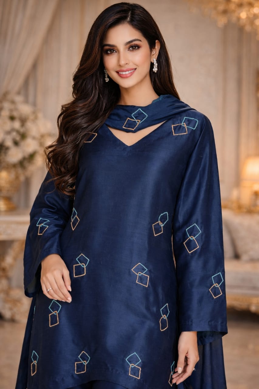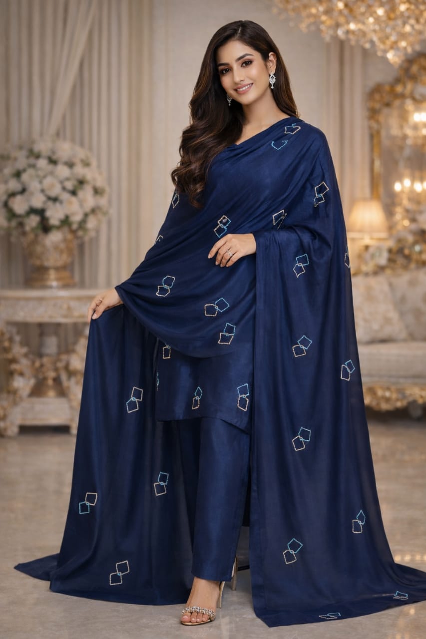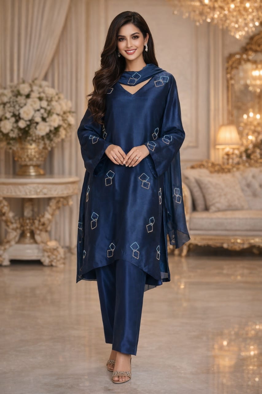 This elegant party wear ensemble features the finest crystal work delicately embellished on both the shirt and dupatta, creating a subtle yet luxurious sparkle. The modern silhouette combined with intricate crystal detailing gives the outfit a refined and sophisticated look, perfect for evening events and special occasions. Designed to appear graceful and contemporary, this outfit is custom made and can be tailored to reflect individual style preferences.